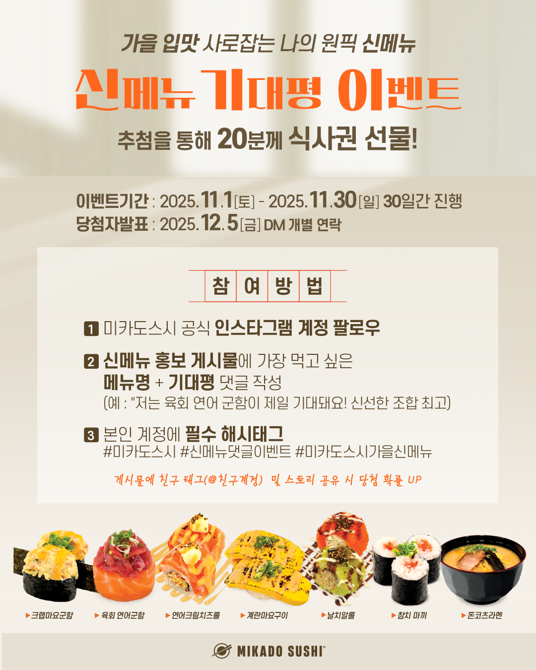이번 가을 신메뉴 7종은 오는 11월 1일부터 전국 미카도스시 매장에서 만나볼 수 있으며, 신메뉴 출시를 기념한 미카도스시 공식 인스타그램 팔로우 댓글 이벤트가 추가적으로 진행된다. 자세한 내용은 미카도스시 홈페이지, 인스타그램 피드를 통해 확인이 가능하다.