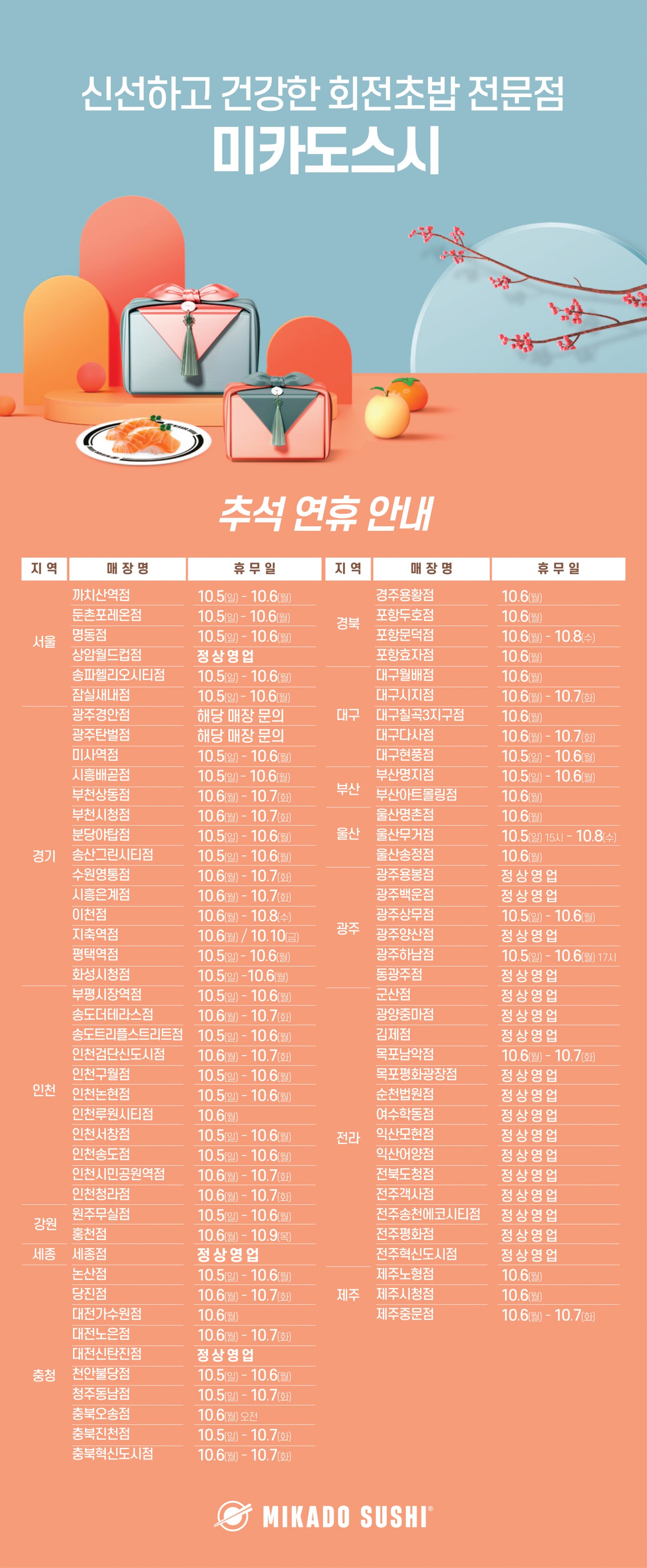 2025 추석 연휴 미카도스시 가맹점 휴무 안내 페이지 정보 작성자최고관리자 작성일25-09-25 조회수230회 본문 다가오는 2025년 추석 연휴를 맞아 미카도스시 가맹점 휴무 일정을 안내드립니다. 점포별 휴무일은 매장마다 상이하오니 자세한 일정은 방문 예정 매장에 직접 문의 부탁드립니다. 늘 미카도스시를 사랑해주시는 고객 여러분께 감사드리며, 풍성하고 따뜻한 한가위 보내시길 바랍니다. 가족과 함께, 미카도스시와 함께하는 즐거운 명절연휴 되세요! 첨부파일 250925_미카도스시 지점별 추석연휴 배너.jpg (4.1M) 1회 다운로드 이전글 [회전초밥창업] 2025년 미카도스시 10월 창업설명회 안내 다음글 [창업설명회] 2025년 미카도스시 9월 창업설명회 안내 목록
