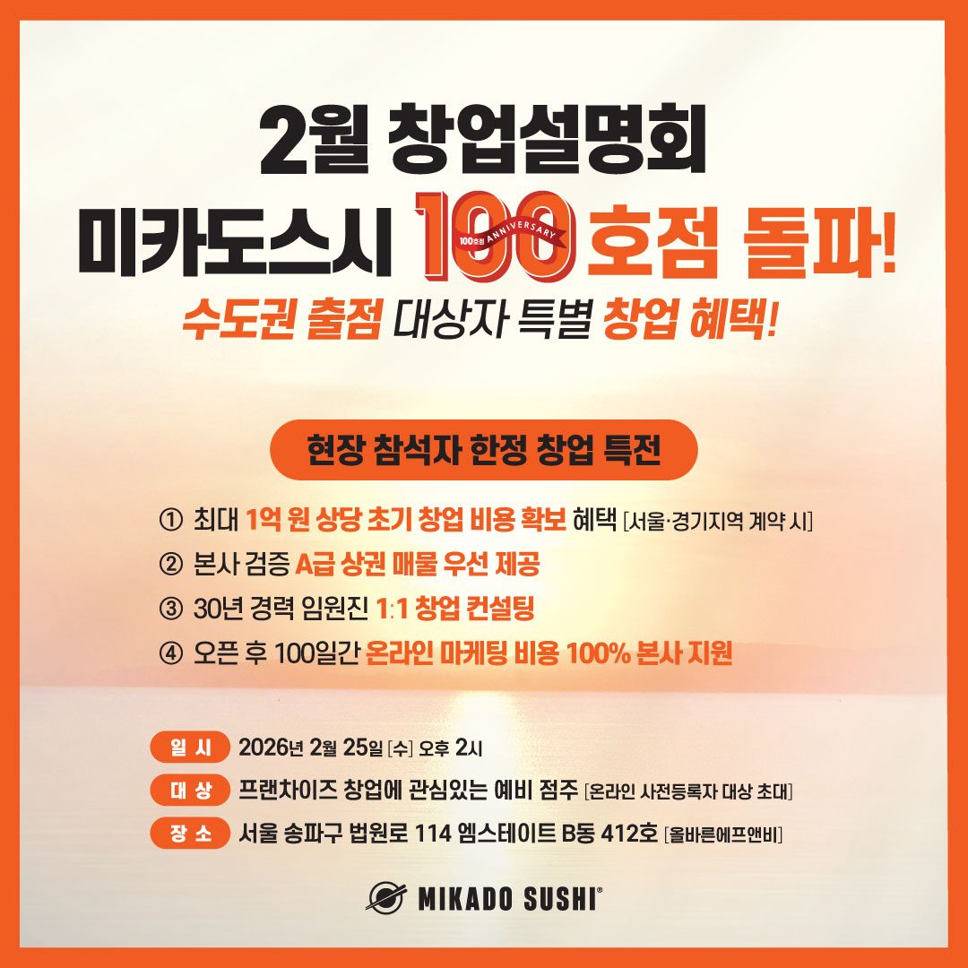 • 행사명 : 2026 미카도스시 2월 창업설명회(서울·경기 상권에서 이미 증명된 100호점의 경쟁력)